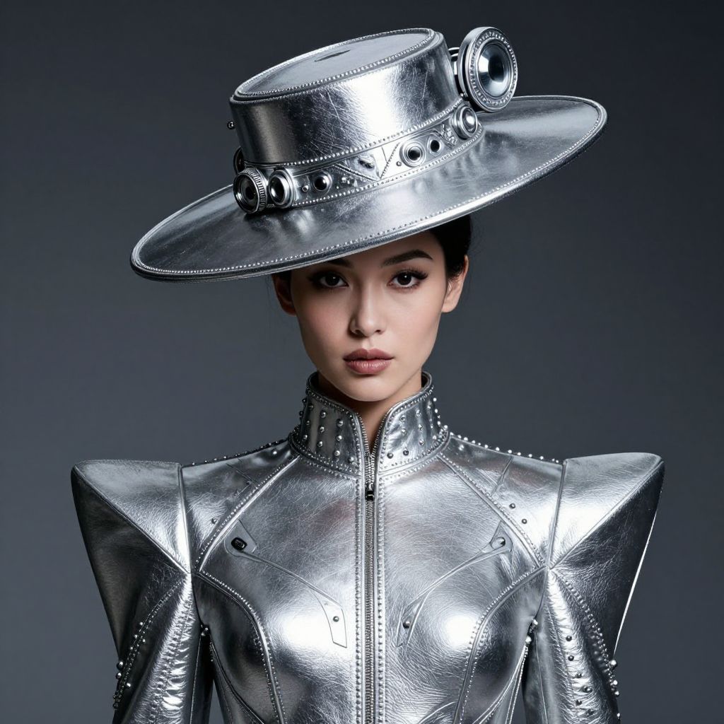In this futuristic fashion editorial photo, a woman is adorned in an elaborate ensemble that exudes a sense of advanced technology and elegance. Her head is adorned with a large, metallic hat that features intricate designs and a series of circular elements, giving it a futuristic and sci-fi aesthetic. The hat's surface reflects light, adding to its high-tech appearance. She is also wearing a high-collared, metallic jacket with a structured, geometric design, complete with studded accents that enhance the futuristic feel. The overall color palette is dominated by shades of silver and metallic tones, creating a cohesive and visually striking look. The composition places the woman centrally, with the hat and jacket framing her face and upper body, drawing the viewer's attention to her striking features and the detailed craftsmanship of her attire. The background is a gradient of dark shades, which contrasts with the bright metallic elements, further emphasizing the futuristic theme.