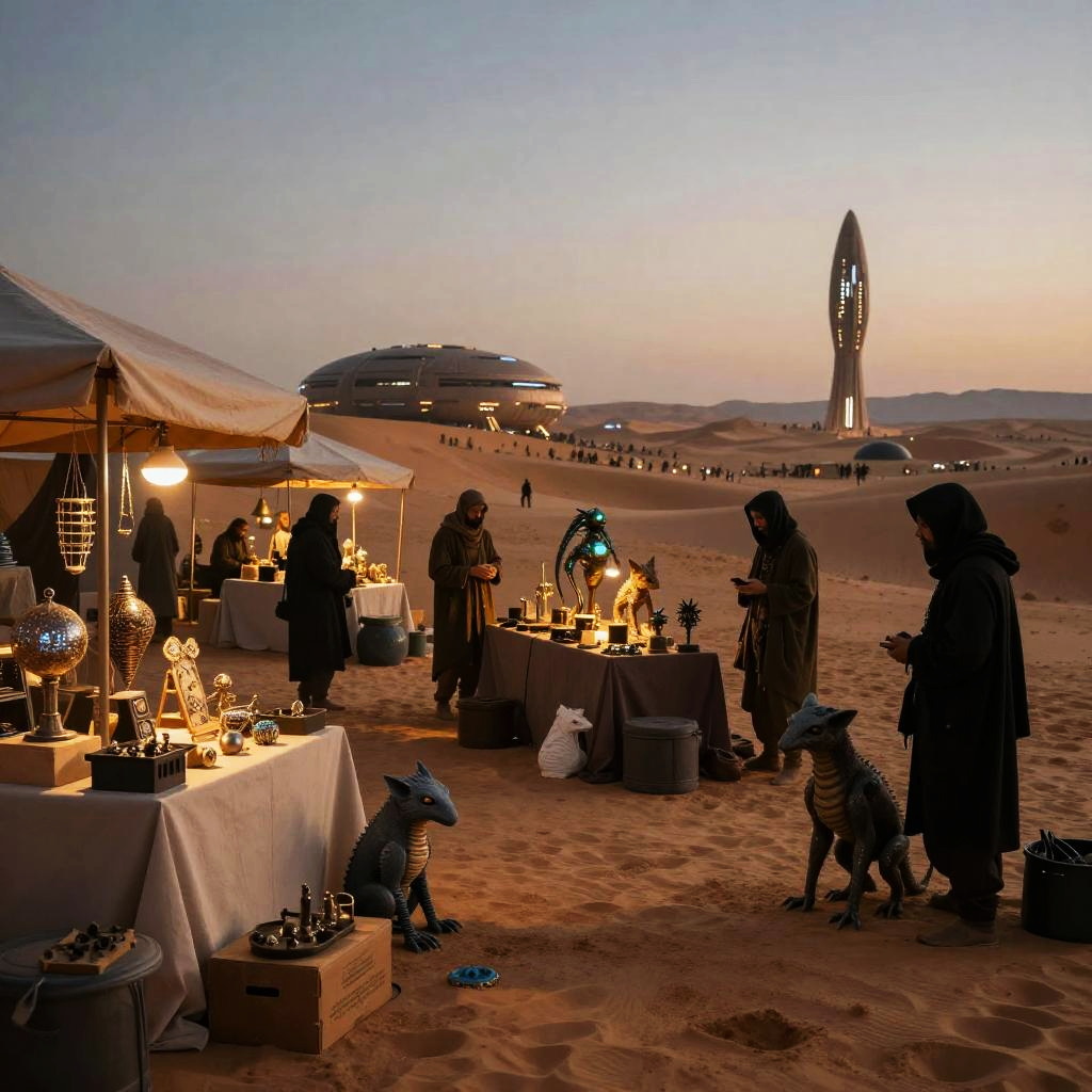 Bene Tleilaxu marketplace scene on a distant desert planet with shadowy vendors trading strange biotech artifacts, cloning products, and bioengineered creatures under fading twilight skies, futuristic and dystopian ambiance.