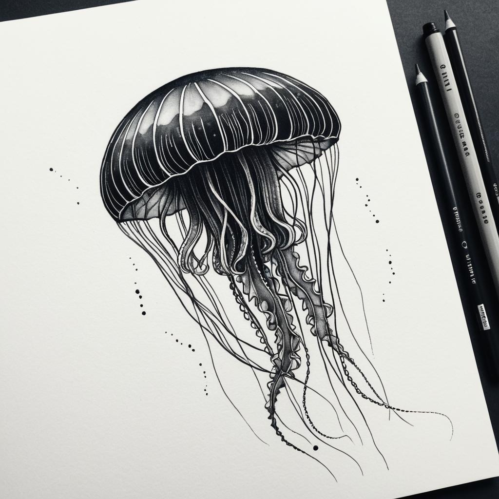 Detailed black and white tattoo design sketch of an elegant jellyfish with intricate tentacles. The drawing is minimalist and vintage in style, capturing a deep ocean abyss aesthetic. Rendered on white paper with pencils and pens visible alongside the artwork.