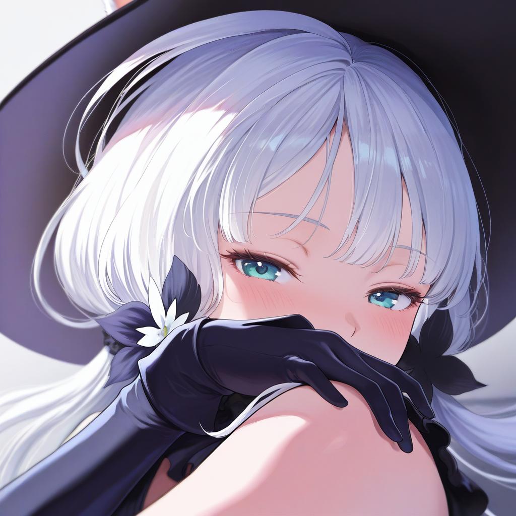 Digital illustration of an anime girl with silver hair and teal eyes wearing a large black hat adorned with dark flowers. She has a soft blush on her cheeks and is partially covering her face with a gloved hand. The artwork features detailed shading and highlights, emphasizing a delicate and elegant character design.