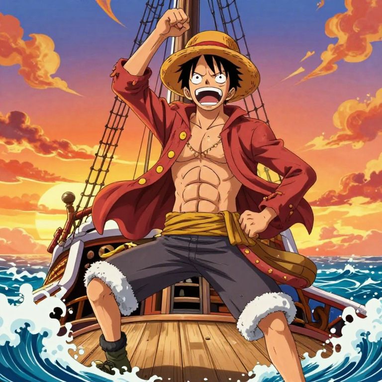 Anime-style drawing of Luffy from "One Piece" shouting on a ship at sunset. He's shirtless, wearing a red jacket, hat,