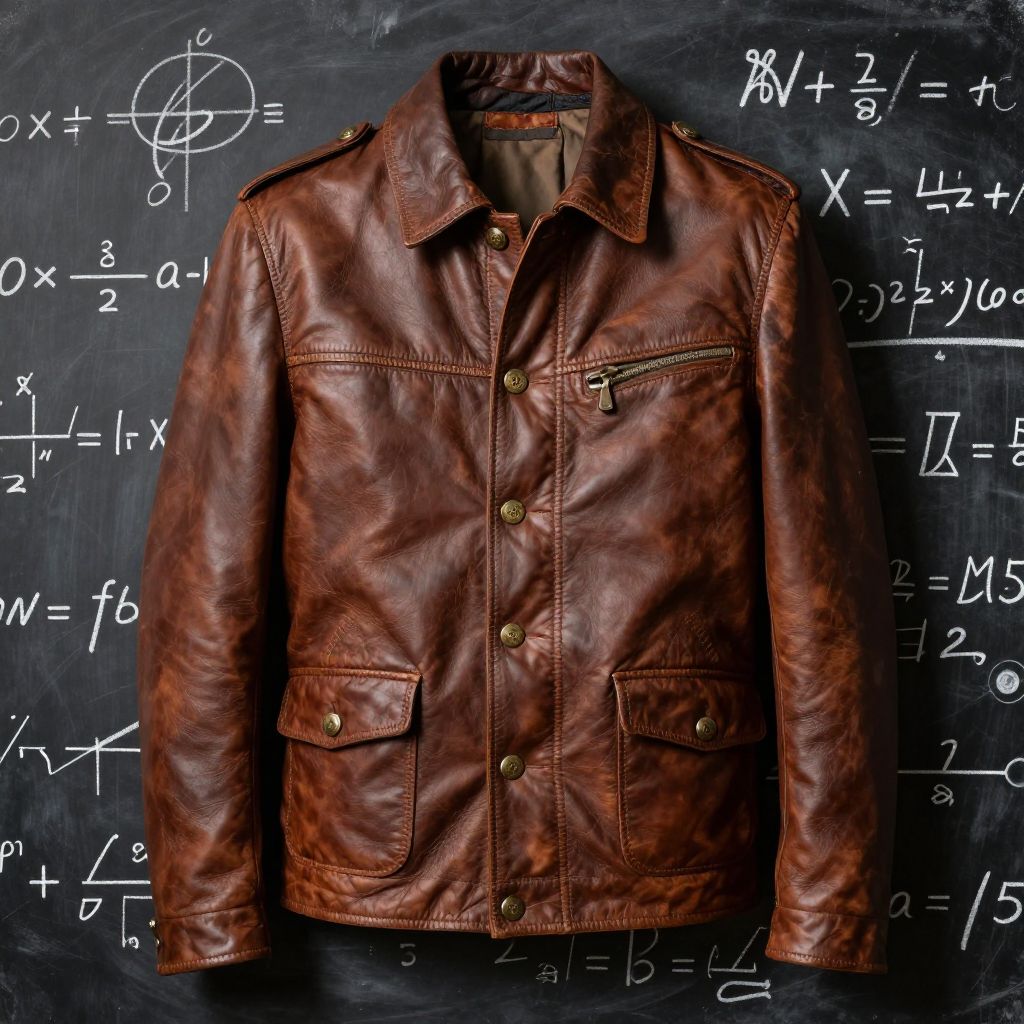 Professor jacket detailed against a chalkboard backdrop filled with complex mathematical equations, vintage leather texture, brass buttons reflecting soft sunlight, evoking a scholarly and intellectual ambiance