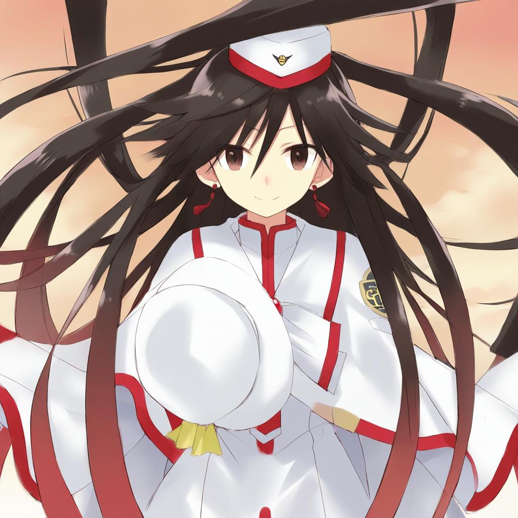 Akira ferrari, aria (manga), 1girl, brown eyes, hair between eyes, long hair, brown hair, very long hair, black hair, himeya company uniform, uniform, himeya company uniform, white dress, uniform, hat, earrings, by artist kuhotaka, leet