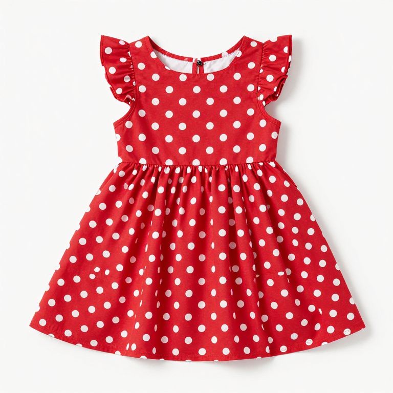 Photograph of a sleeveless, red, polka dot dress with white dots. The dress has a round neckline with small, ruffled shoulder straps and a cinched waist that flares out into a full, A-line skirt. The fabric appears to be a smooth, satin-like material, adding a slight sheen. The dress is displayed against a plain white background, highlighting its vibrant color and playful pattern. The polka dots are evenly spaced, creating a classic, retro look. The dress is centrally positioned, with its front facing forward.