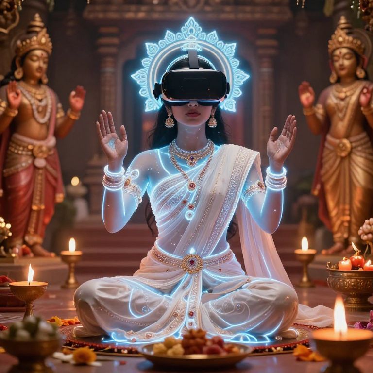 Indian actress AI performing in a virtual reality temple ceremony, her digital form glowing with traditional motifs, surrounded by AI-generated devotional chants and digital flames, ethereal and spiritual atmosphere.