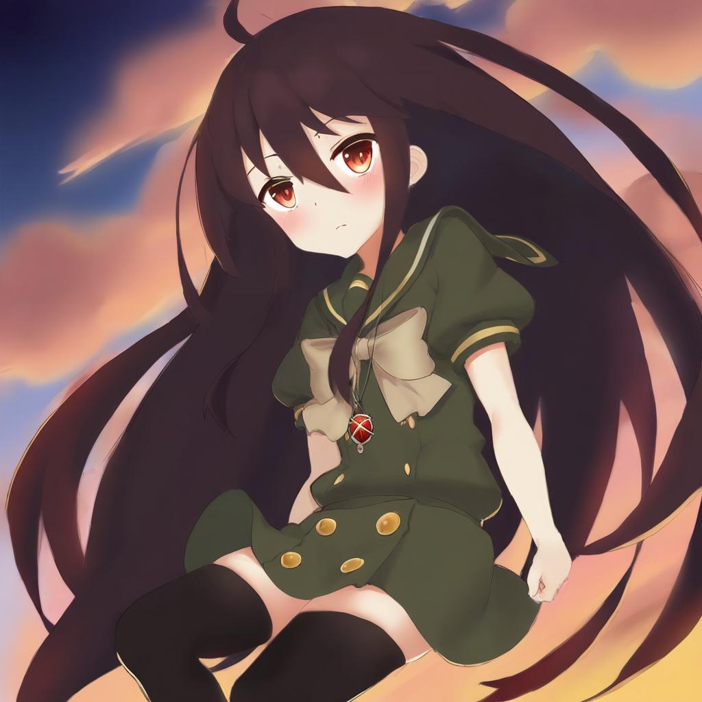 Anime-style illustration of a girl with very long black hair and red eyes wearing a green school uniform with gold buttons and a large bow. She is accessorized with a red pendant necklace and black thigh-high stockings. The background features a soft sunset sky with pink and orange clouds.