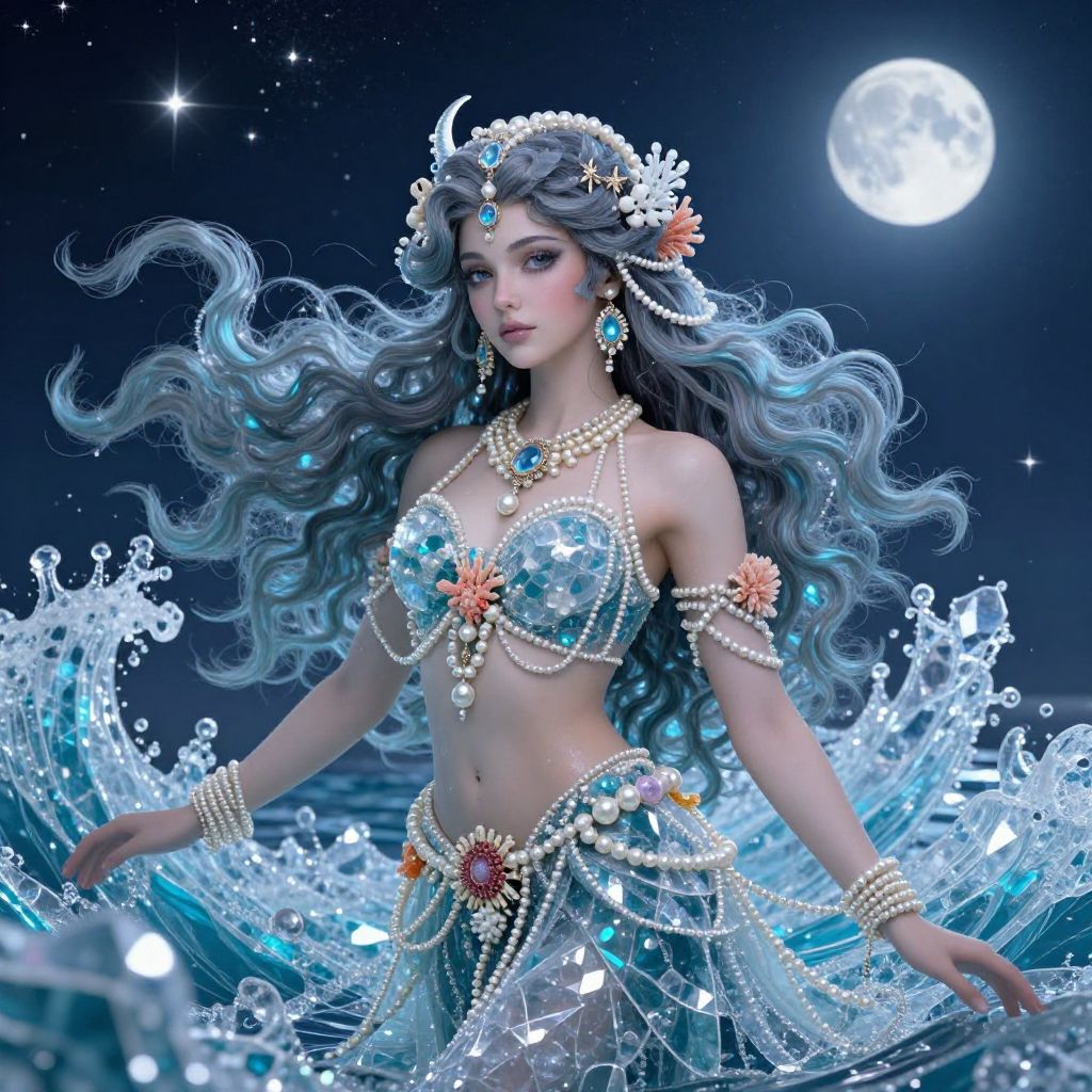Maluna, an elegant ocean goddess emerging from crystalline waves, adorned with pearls and coral jewelry, her hair flowing like seaweed, under a moonlit night sky filled with stars, in a highly detailed fantasy illustration.