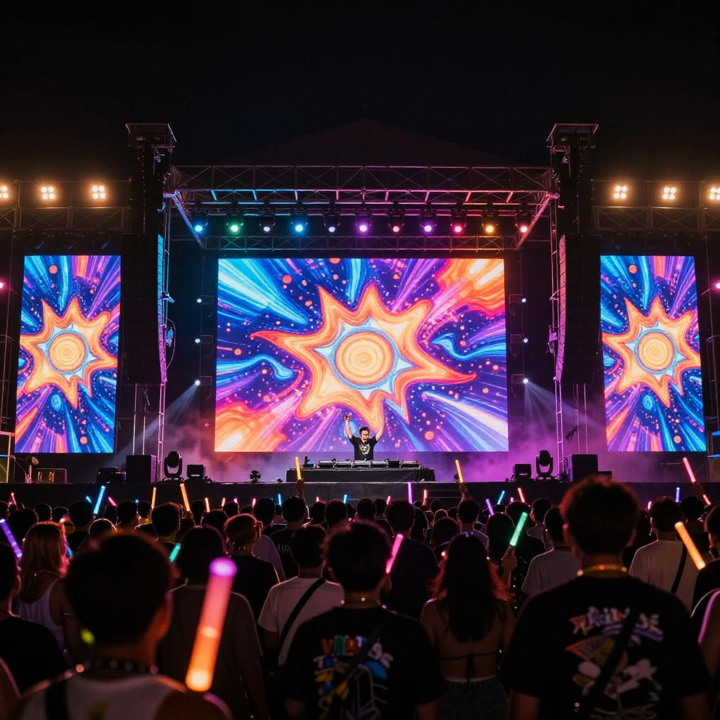 Ravinger DJ on an elevated stage, massive LED screens displaying colorful visuals, crowd with glow sticks and rave outfits, night scene filled with energy and excitement