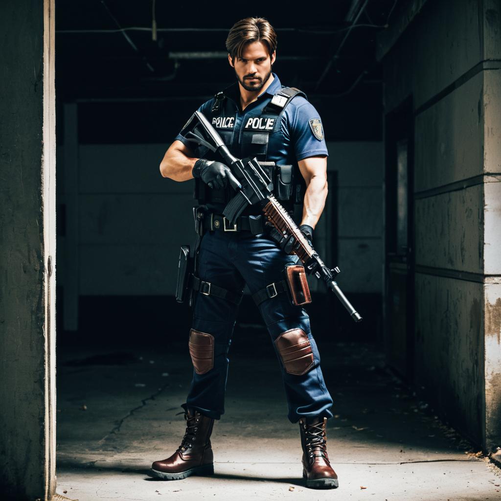 Resident evil vector costume,1boy,male focus,solo,weapon,gun,gloves,handgun,holding,facial hair,brown hair,standing,holding weapon,realistic,boots,holster,police,holding gun,pants,uniform
