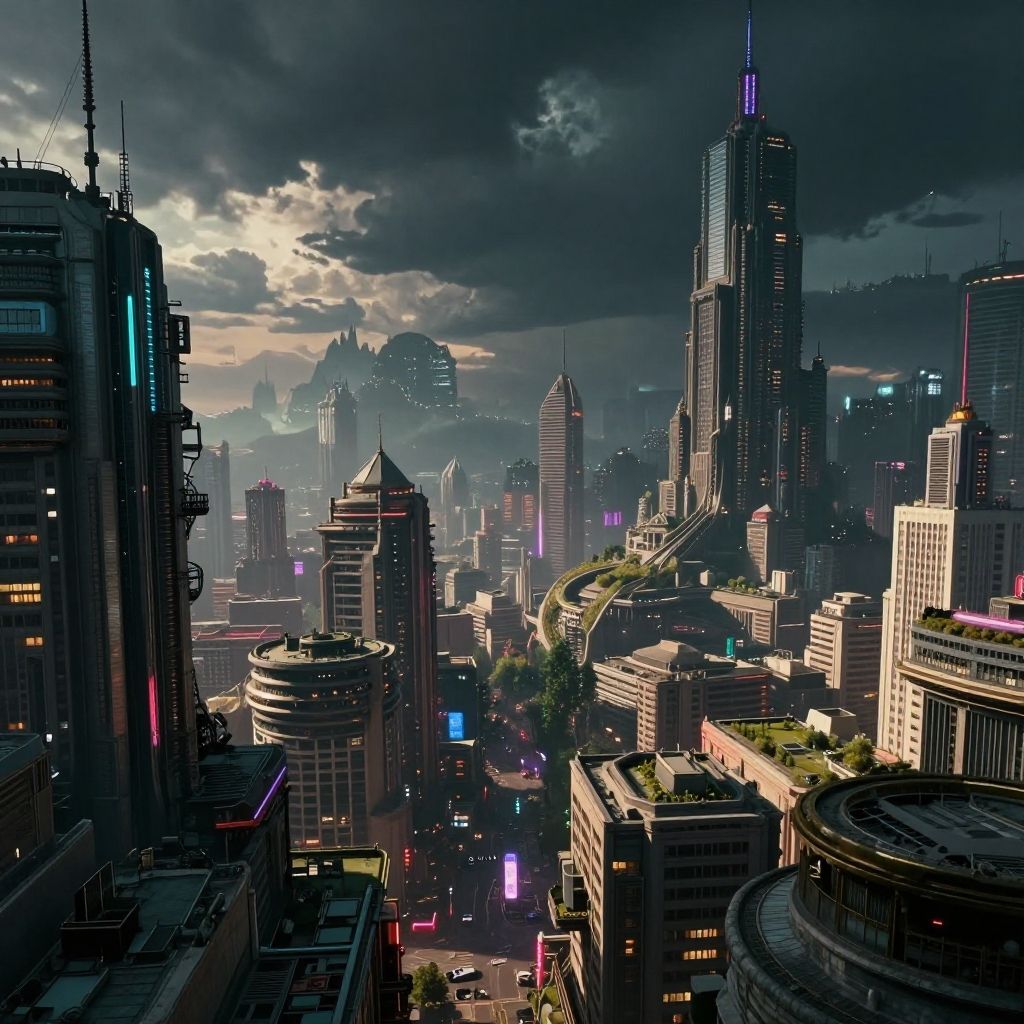 CGI cityscape at dusk; futuristic skyscrapers with neon lights, dark clouds, and a winding highway cutting through the urban landscape.