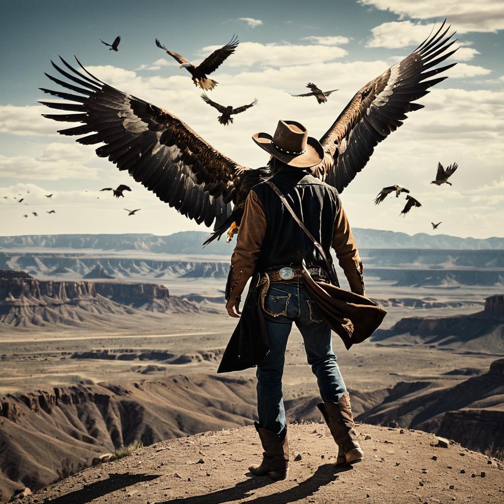 A dramatic scene featuring an outlaw with a stedeagle landing on their arm. The composition highlights weathered roughspun garments, the bird’s gripping talons in a sun-drenched frontier haze.