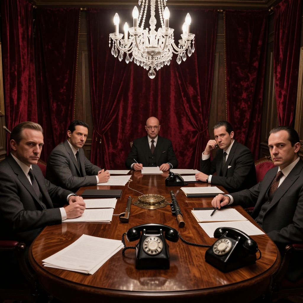 Mafia meeting room, opulent design with red velvet drapes and crystal chandeliers, large mahogany table surrounded by serious men in classic suits, old-fashioned rotary phones, piles of documents and weapons, moody lighting with deep shadows