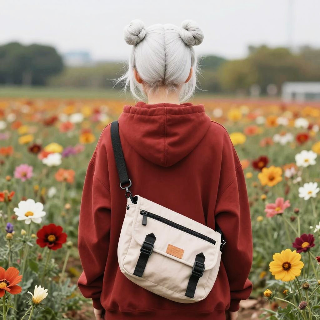 Double buns, platinum white girl with red hoodie and messenger bag standing in a field of flowers