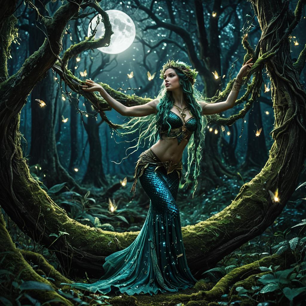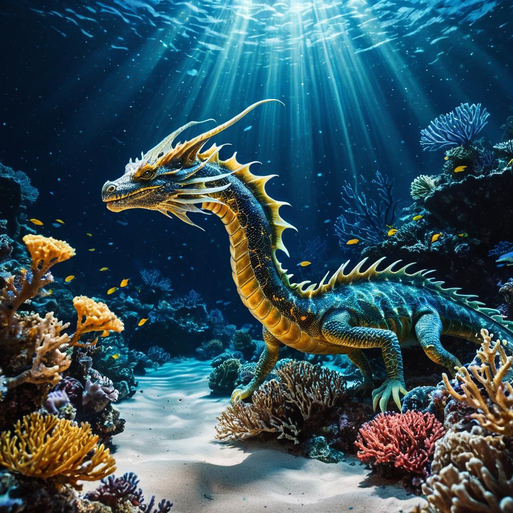 An ethereal sea dragon posing gracefully on underluminescent coral reef with swift, sinuous movement among the corals. The scene captures a mystical moonlight atmosphere, with gentle waves and golden sand enhancing the tranquil vibe. The mermaid has glowing scales and bioluminescent fins, and the composition emphasizes the enchanting beauty and mythical allure of the character. Rendered in a highly detailed, photorealistic style, the image brings together fantasy and nature in a harmonious, captivating scene.