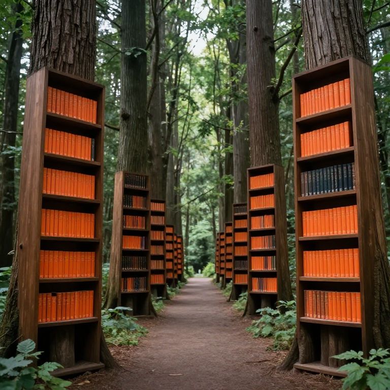 Whispering trees stand tall along a serene pathway, their trunks seamlessly integrated with wooden bookshelves filled with vibrant orange spines, creating an enchanting forest library where nature and knowledge intertwine.