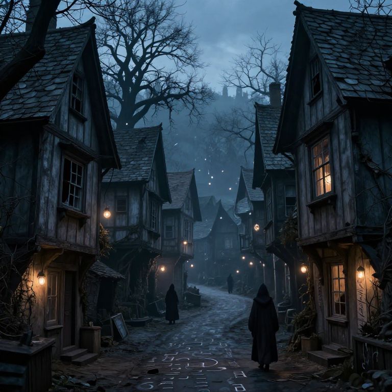 Dark fantasy town engulfed in perpetual twilight, crooked timber-framed houses with broken windows, spectral lights floating in the air, winding alleys filled with mysterious runes, inhabitants wearing hooded robes, foreboding atmosphere beneath twisted, leafless trees.