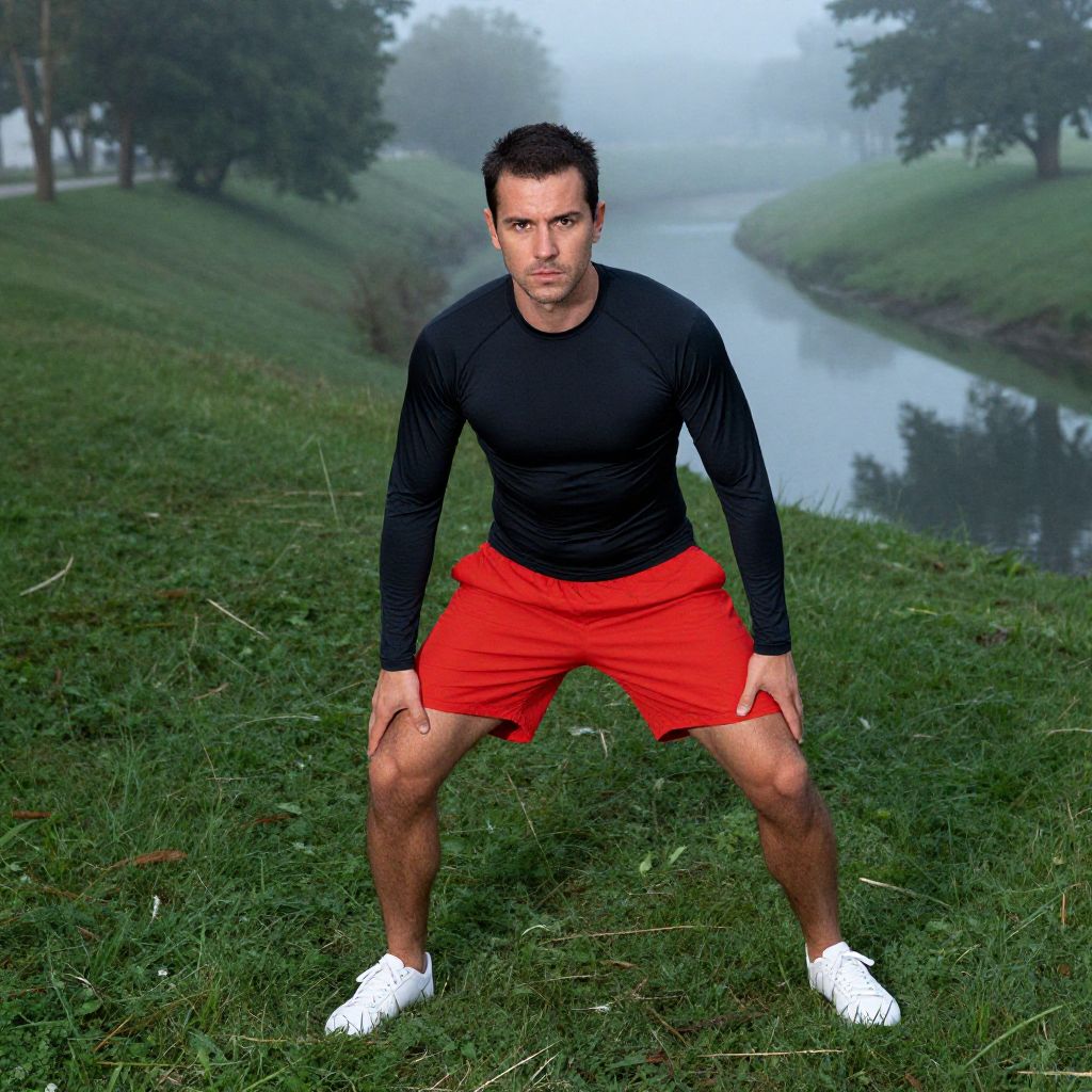 Photograph of a muscular, Caucasian man with short, dark hair, standing in a foggy, green grassy field. He is crouched with legs apart, wearing a black long-sleeve shirt, bright red athletic shorts, and white sneakers. A narrow river winds through the misty background, flanked by trees on either side. The grass is lush and the fog adds a mystical, soft-focus effect to the scene, highlighting the man's focused expression and athletic build. The overall composition emphasizes his physical readiness and the serene, natural landscape.