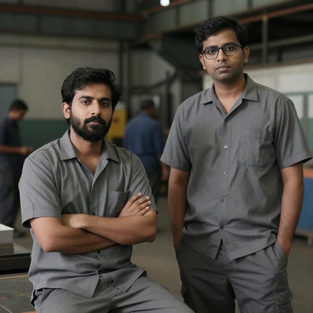 Photograph of two men in a industrial setting. The man on the left, with dark hair and a beard, sits with arms crossed, wearing a gray striped shirt and pants. The man on the right, with short dark hair and glasses, stands with hands in pockets, wearing a similar gray striped shirt and pants. Background includes blurred workers and metal structures.