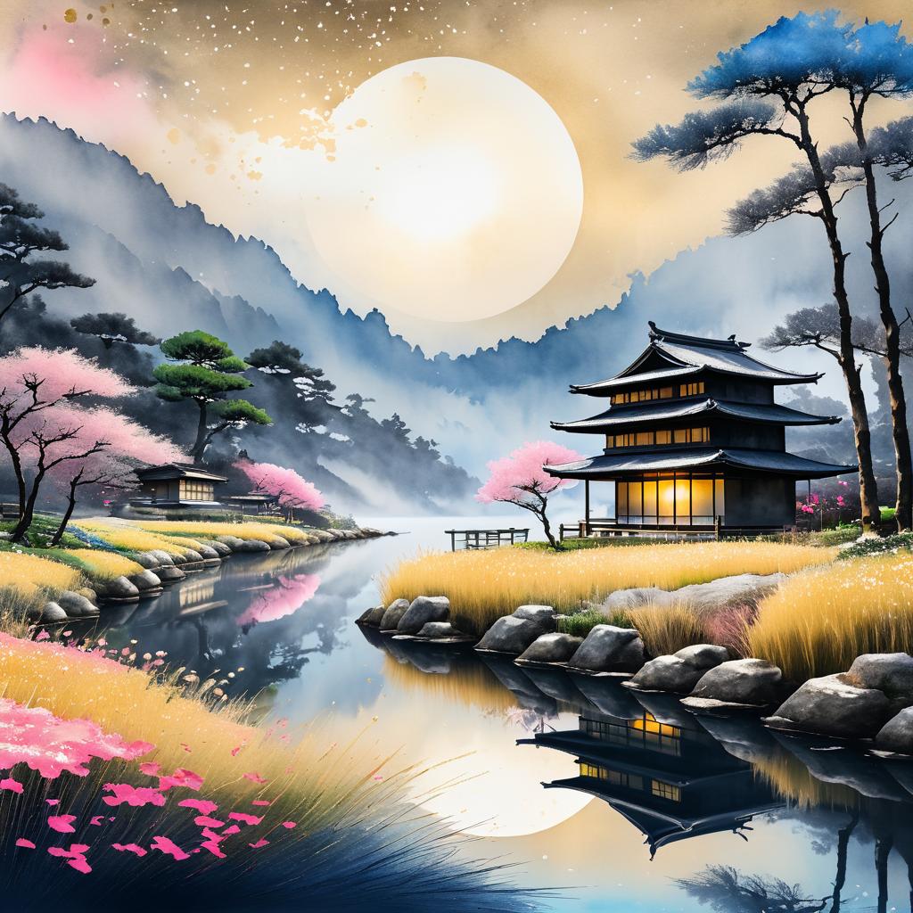 Watercolor-style illustration of a traditional Japanese shrine beside a reflective water body, surrounded by blooming cherry blossom trees, golden fields, and misty mountains under a large glowing moon. The scene features soft, muted colors, delicate brush textures, and a peaceful atmosphere with elements of Shinto architecture and natural beauty.