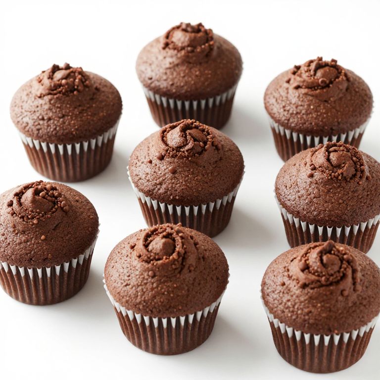 Photograph of seven chocolate cupcakes arranged in a loose circle on a white background. The cupcakes have dark brown, moist-looking tops with a slightly rough texture and swirls of chocolate frosting. Each cupcake is encased in a dark brown paper liner with white crimped edges. The lighting is bright and even, highlighting the rich chocolate color and texture of the cupcakes. The image has a clean, minimalistic style, focusing on the cupcakes without any additional background elements.