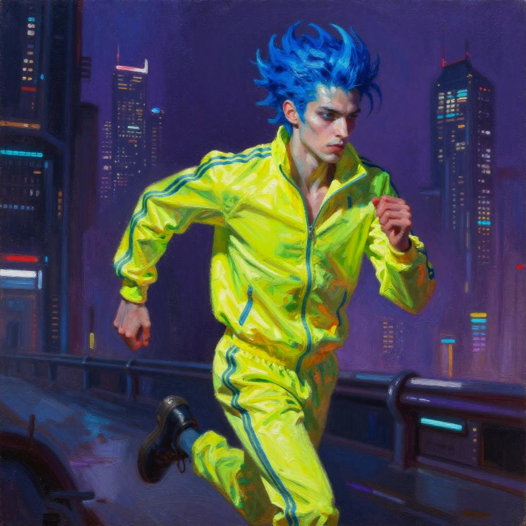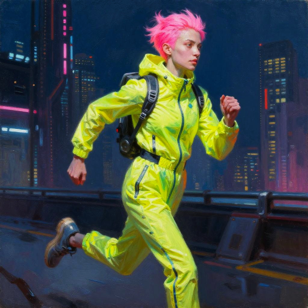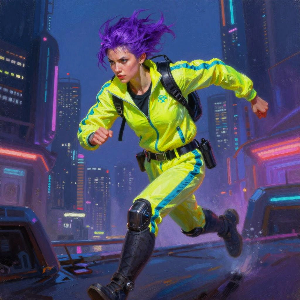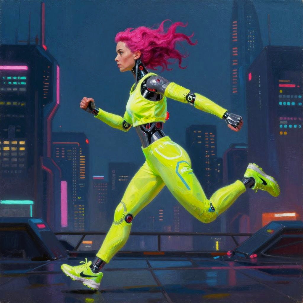 Portrait of a agile cybernetic gymnast with magenta hair, wearing bright neon sportswear, running in a futuristic cyberpunk city. Oil painting style by Simon Stalenhag, Beeple, Artgerm, with rich neon tones, chiaroscuro lighting, dynamic pose, fantasy realism.