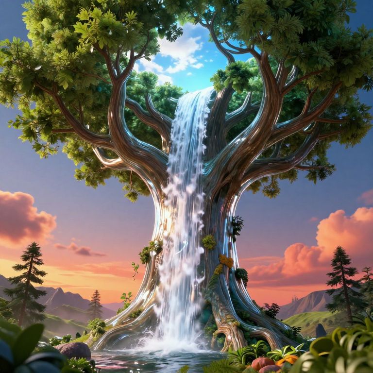 Photorealistic digital artwork of a massive, twisted tree with a cascading waterfall at its center, set against a vibrant sunset sky and lush forest landscape
