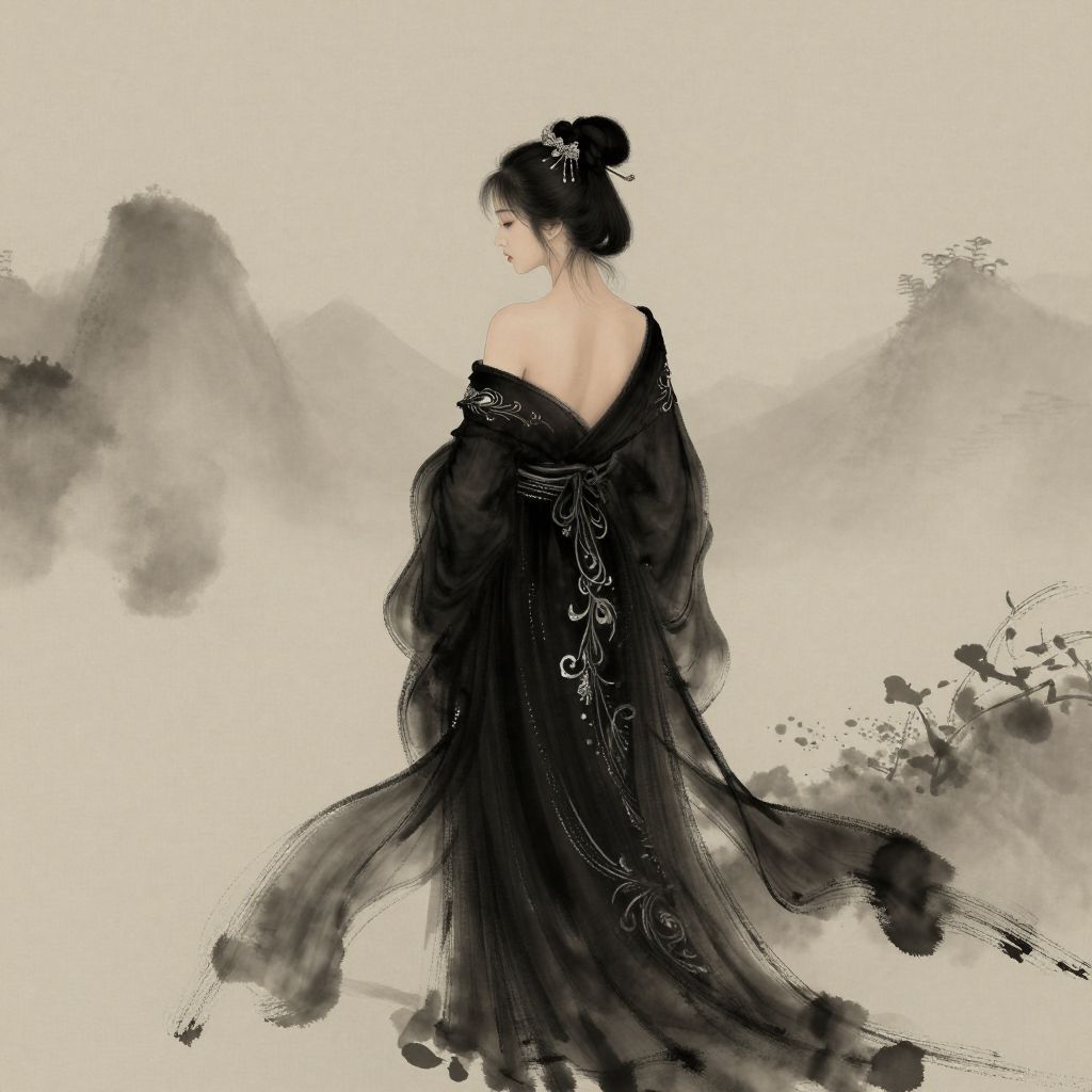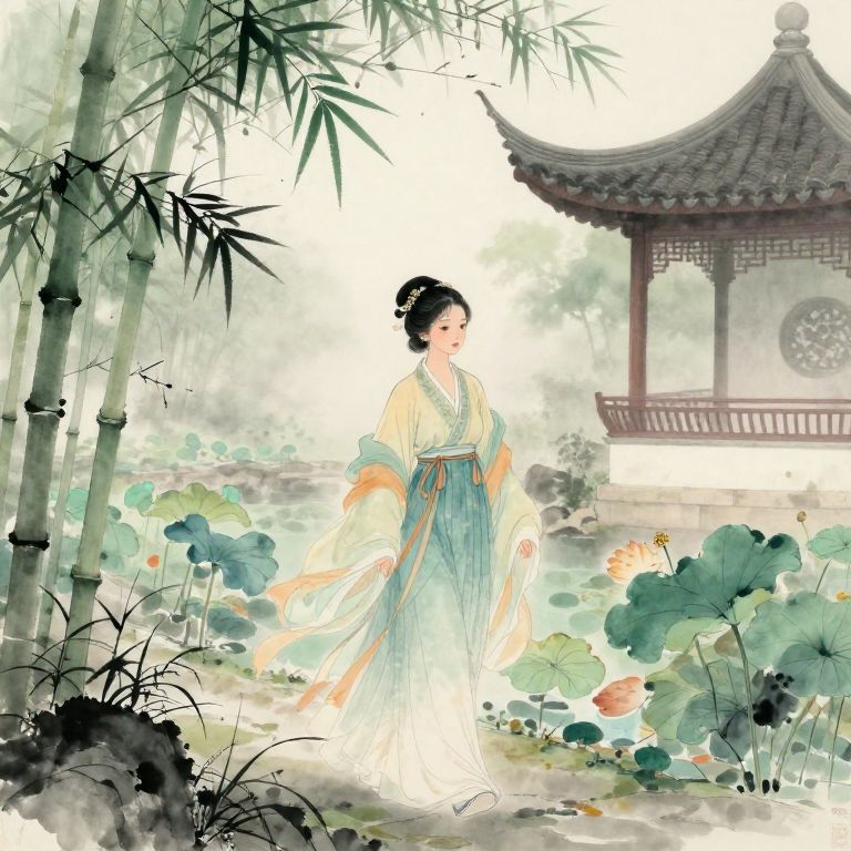 Tang Yue walking through ancient Chinese garden, wearing flowing hanfu dress, surrounded by bamboo and lotus ponds, misty morning light, detailed nature scenery, peaceful and reflective mood, watercolor and ink painting style, subtle pastel color palette.