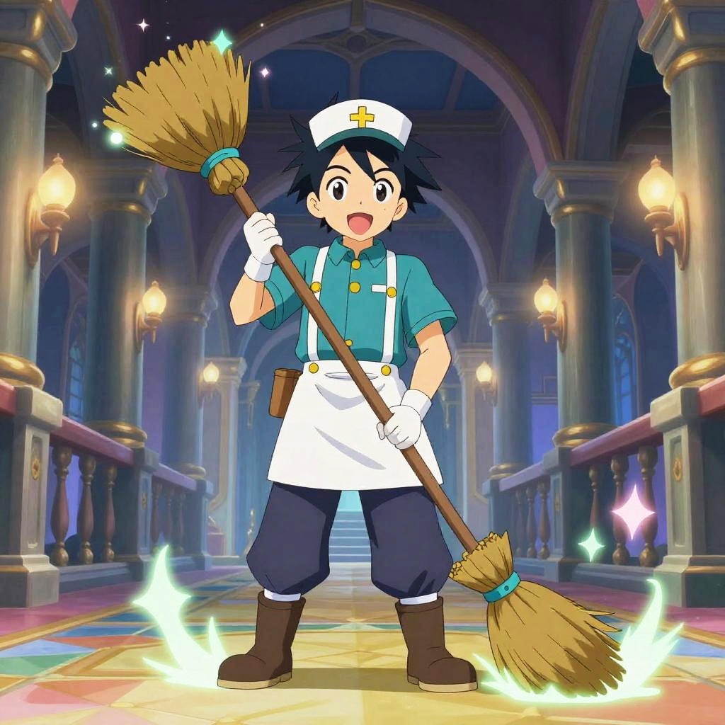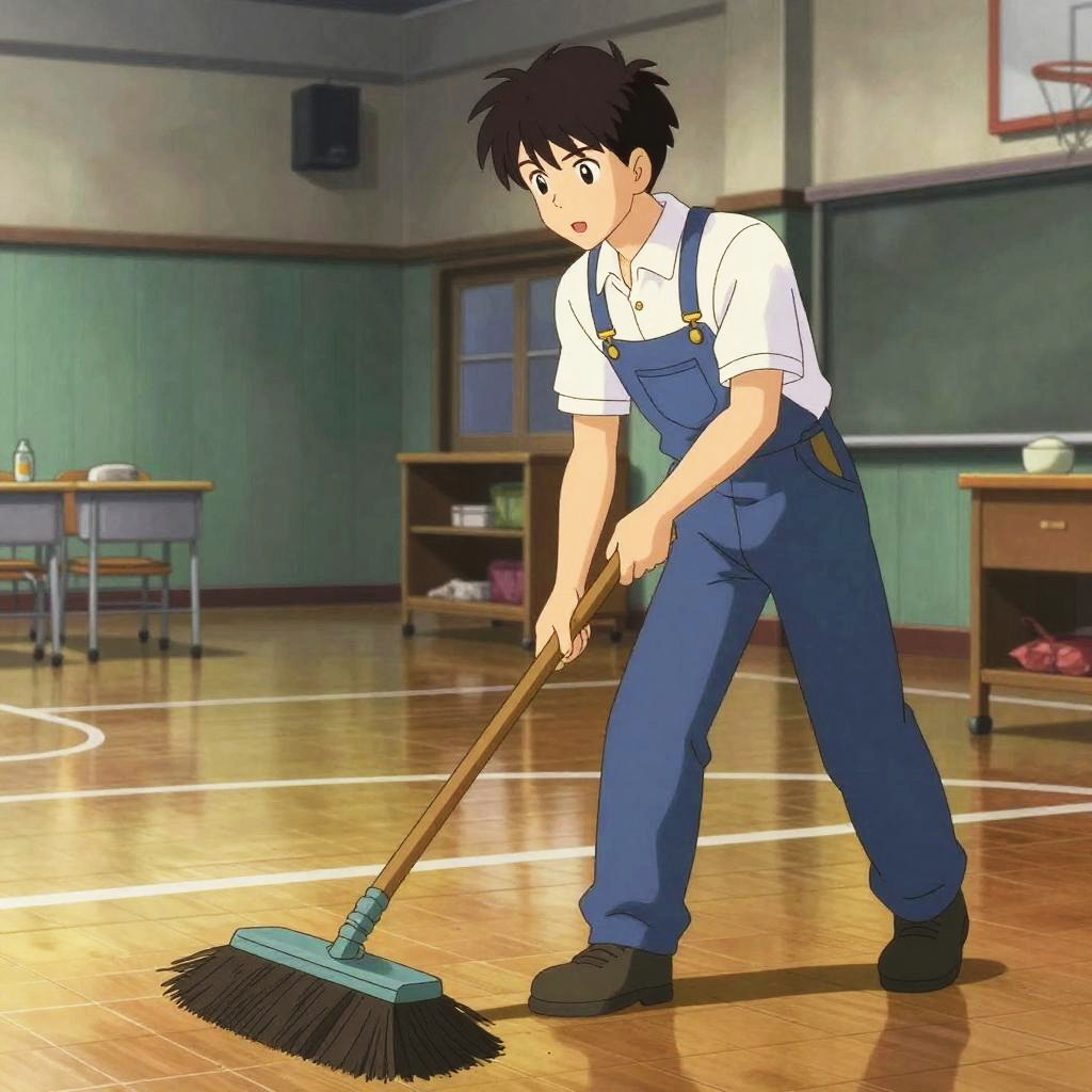 Anime-style digital illustration of a young boy in blue overalls and white shirt, cleaning a wooden gym floor with a broom. Background includes desks,