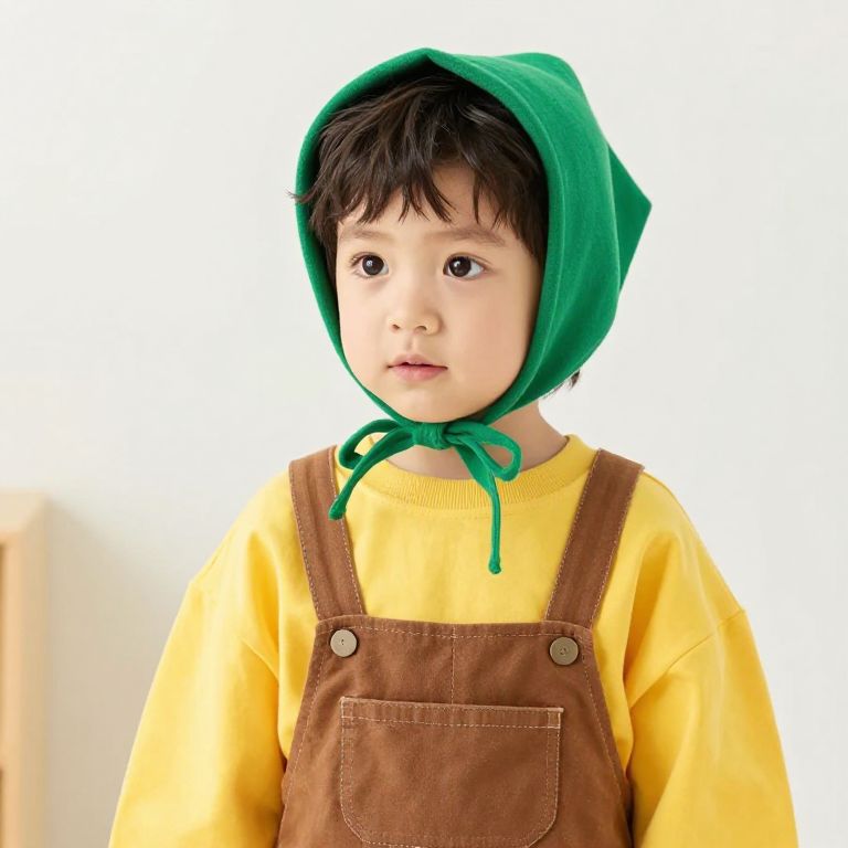 Boy wearing a yellow outfit with a green bonnet and brown overalls.