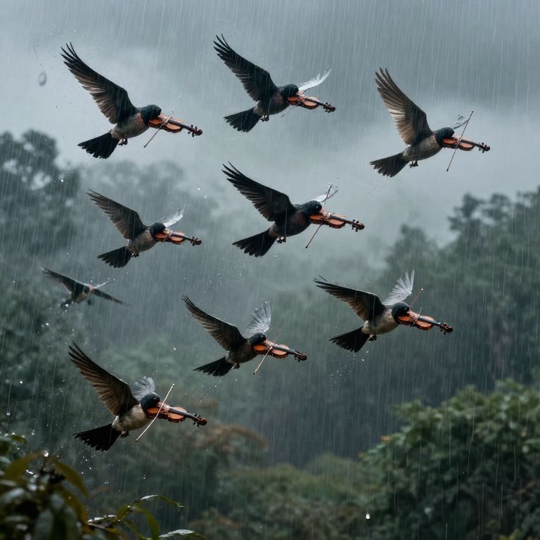 In a surreal digital artwork rendered in high-definition detail, raindrops transform into soaring birds, each adorned with a miniature violinist, creating a symphony of thunderous melodies amidst a misty, forested backdrop.