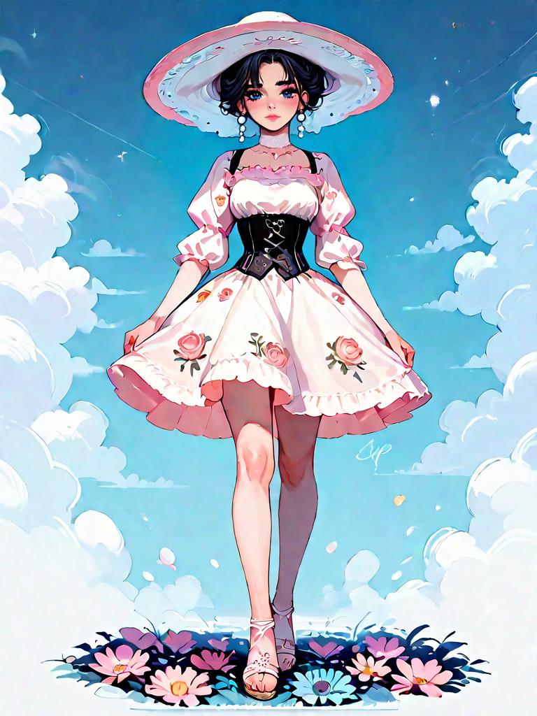 Digital art of a full-body dark fantasy female character standing in a misty nighttime environment. The woman has long dark hair with purple tips and wears a white cropped blouse with puff sleeves and lace details, paired with a high-waisted, tiered blue midi skirt with ruffled hem and embroidered accents. She stands against a mystical sky with pink and blue mist and a glowing circular halo.