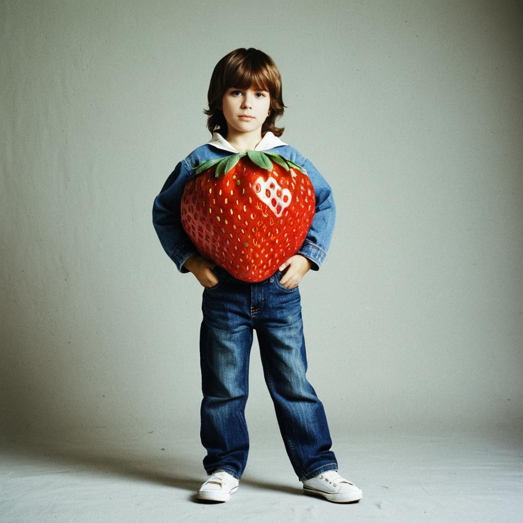 Strawberry bubble costume, 1boy, male focus, solo, fruit, food, child, standing, full body, denim, pants, looking at viewer, brown hair