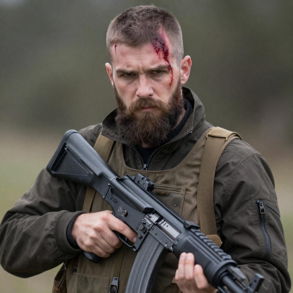 Photograph of a bearded man with a close-cropped haircut, holding a black assault rifle with both hands. He has a serious expression, blood on his forehead, and is wearing a dark brown jacket. Background is blurred.