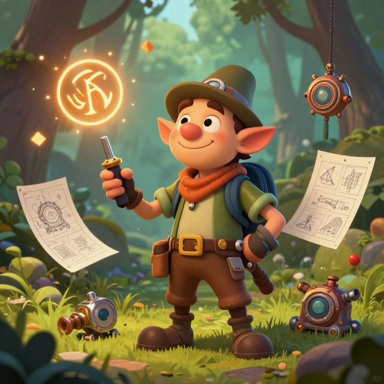 A vibrant CGI illustration of a cartoon elf adventurer standing in a lush forest. The elf has large, pointy ears, a red nose, and wears a green shirt, brown pants, a black cap with a compass, and a red scarf. He holds a small flashlight in his right hand and two sketch papers with diagrams in his left. Two small, round, robotic gadgets with glowing eyes are on the grass near him. An orange, glowing circular symbol hovers above his head. The background features tall trees and dense greenery, bathed in soft sunlight.