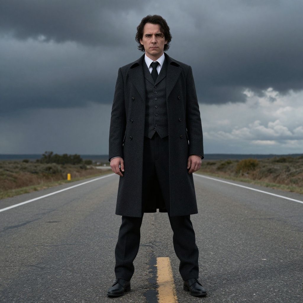 Photograph of a serious man with curly black hair, wearing a black three-piece suit and long coat, standing on a deserted, cloudy road.
