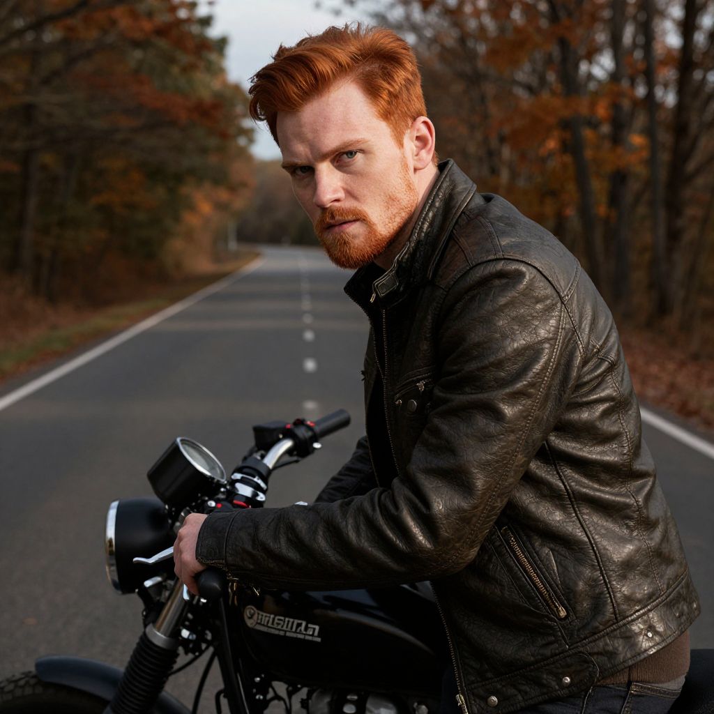 Attractive ginger man with short bright red hair and a trimmed beard, sharp facial features, wearing a leather jacket, leaning against a vintage motorcycle on an empty road surrounded by autumn trees, moody atmosphere with sharp shadows and warm highlights.