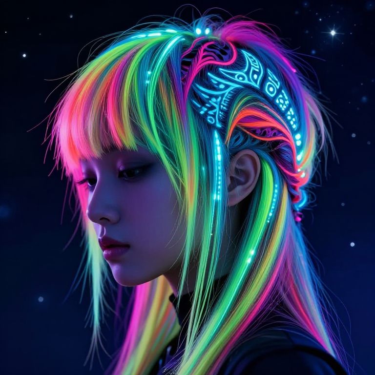 Alien hair style featuring vibrant neon colors and intricate patterns, glowing softly under a cosmic night sky, futuristic fashion with bioluminescent strands, highly detailed close-up.