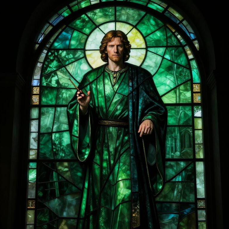 Utopian Stained glass art piece of medieval Luke Skywalker . Color tone is green and black, Cinematic 8K.,