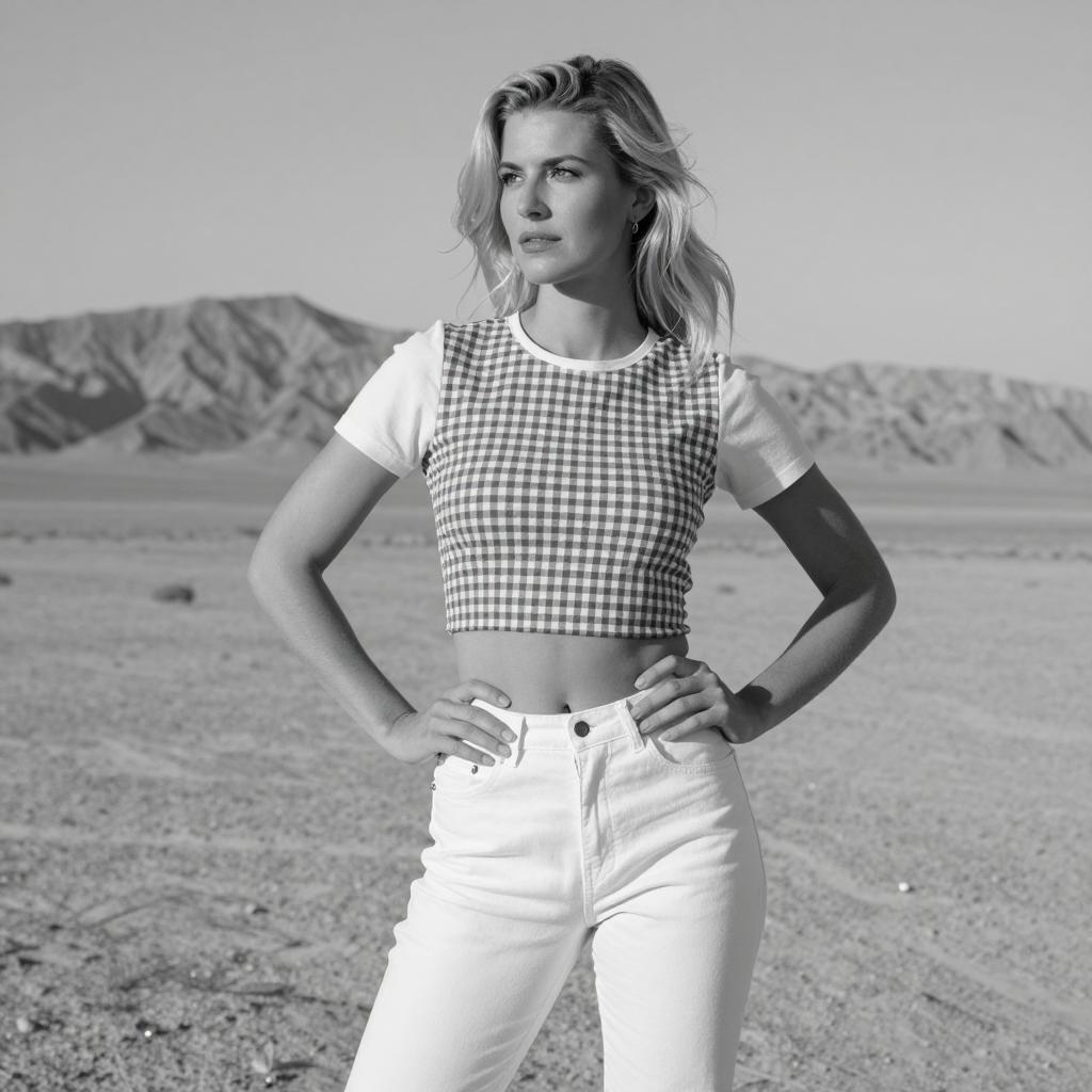 Black-and-white photograph of a blonde woman with medium-length hair, wearing a checkered crop top with white sleeves and high-waisted white pants, standing in a barren desert with mountain ranges in the background. She is looking to the side with a neutral expression. She has a slim build and is standing with her hands on her hips. The desert is flat with a distant horizon.