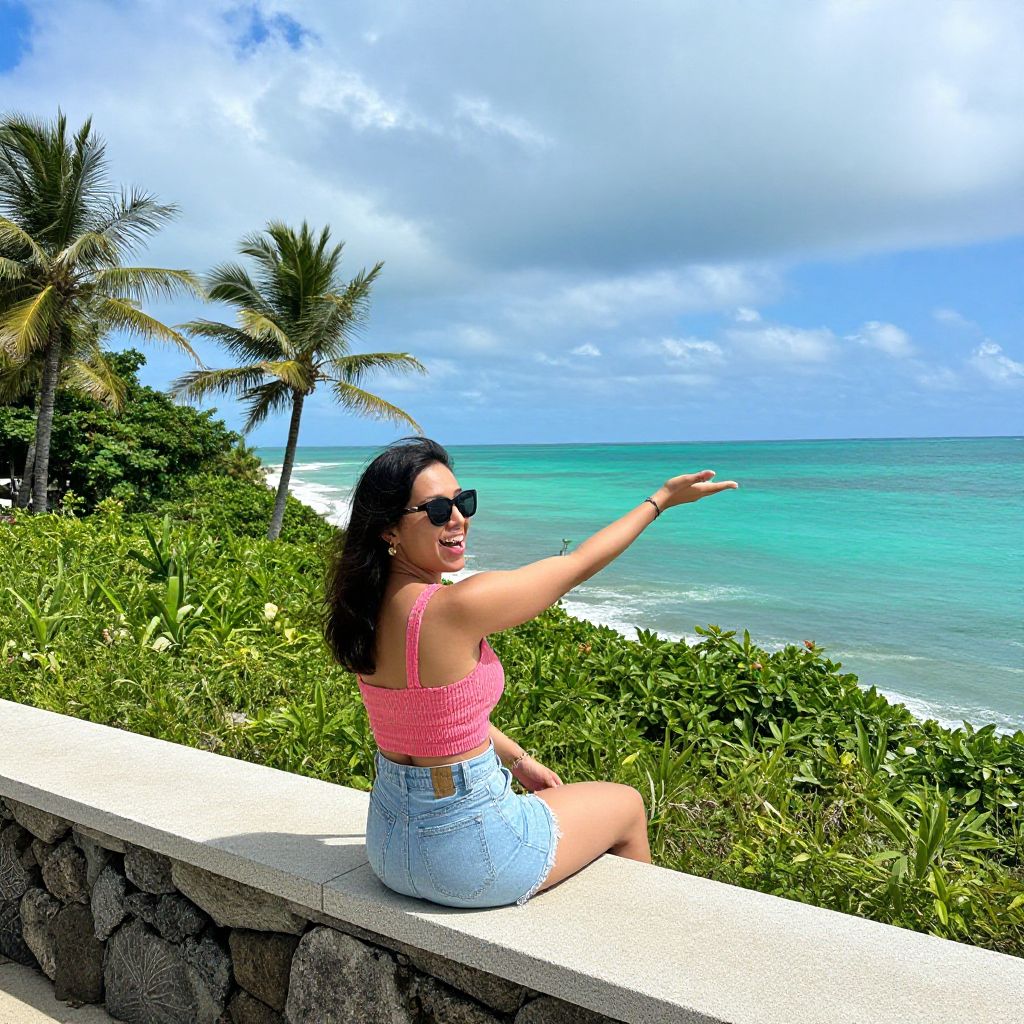 Woman sitting on a stone ledge overlooking a vibrant turquoise ocean, gesturing toward the horizon with a wide smile, framed by lush greenery and palm trees beneath a partly cloudy sky.