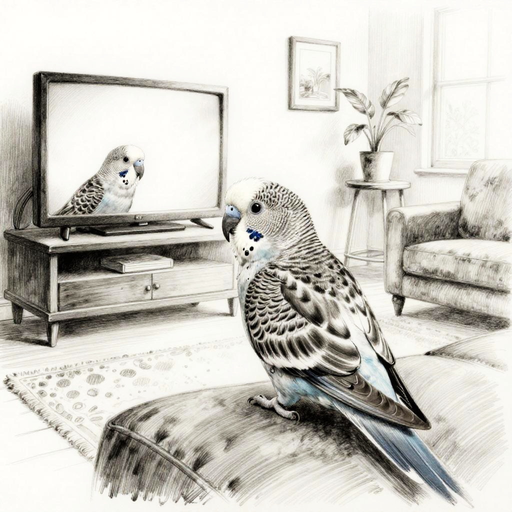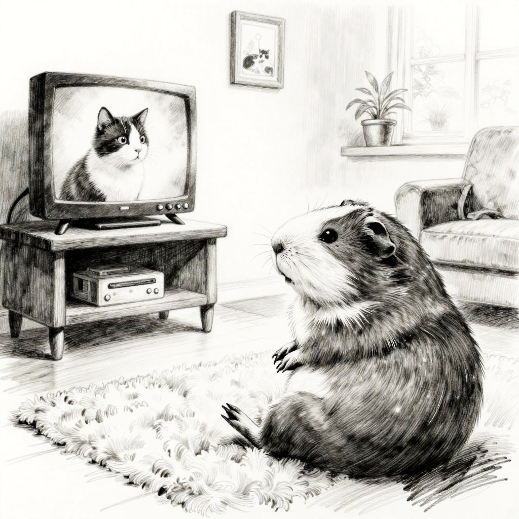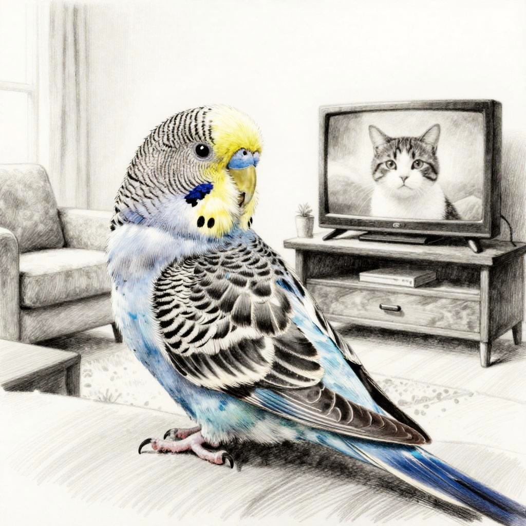 An inked drawing of a contented budgie relaxing in a living room, watching another cat on the television. Rendered in high-quality charcoal with detailed fur and subtle highlights, the scene has a tranquil ambiance. This realistic and detailed artwork captures the contentment and peacefulness of a content budgie enjoying a quiet moment, with an overall calm and serene atmosphere.