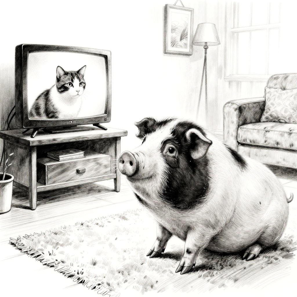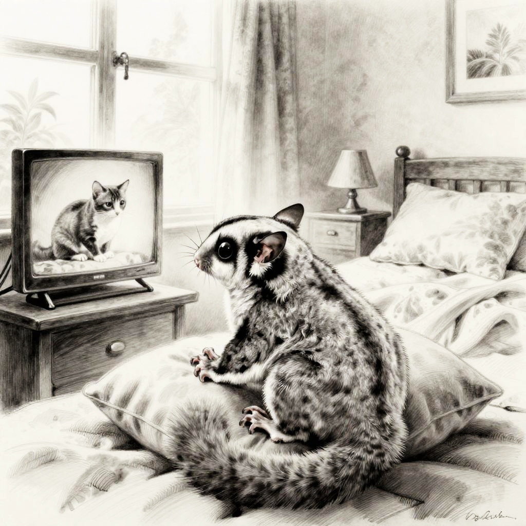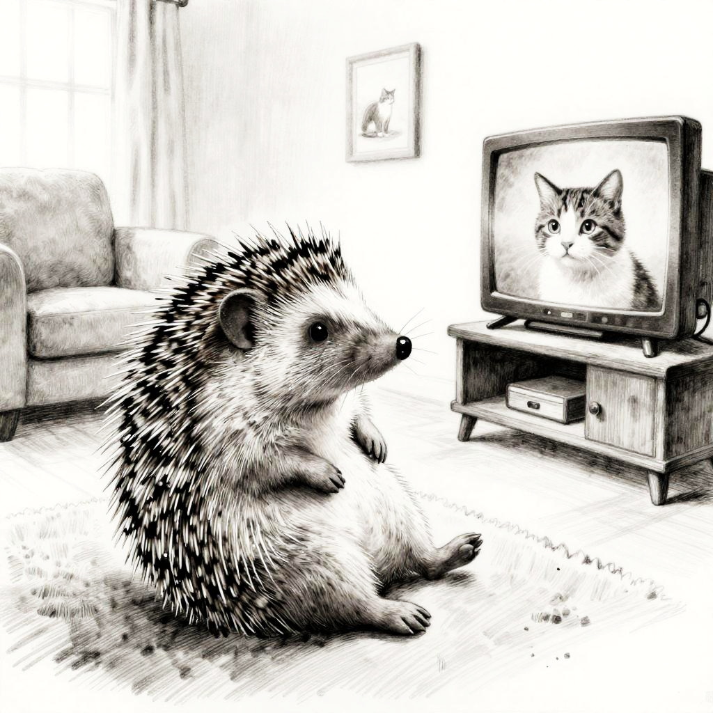 An inked drawing of a contented budgie relaxing in a living room, watching another cat on the television. Rendered in high-quality charcoal with detailed fur and subtle highlights, the scene has a tranquil ambiance. This realistic and detailed artwork captures the contentment and peacefulness of a content budgie enjoying a quiet moment, with an overall calm and serene atmosphere.