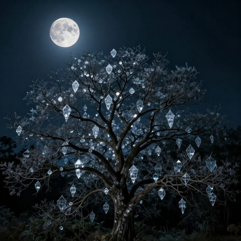 A surreal digital artwork captures the mystique of a moonlit night, showcasing an awe-inspiring tree with branches extending towards the celestial expanse above. From a bird's-eye view, delicate glass-like structures adorn the tree's surface, creating intricate patterns that reflect the otherworldly light, evoking feelings of wonder and nostalgia as they blur the boundary between reality and dreamscape. This hauntingly beautiful image unveils nature's enigmatic charm, inviting viewers to ponder hidden meanings within its captivating imagery.