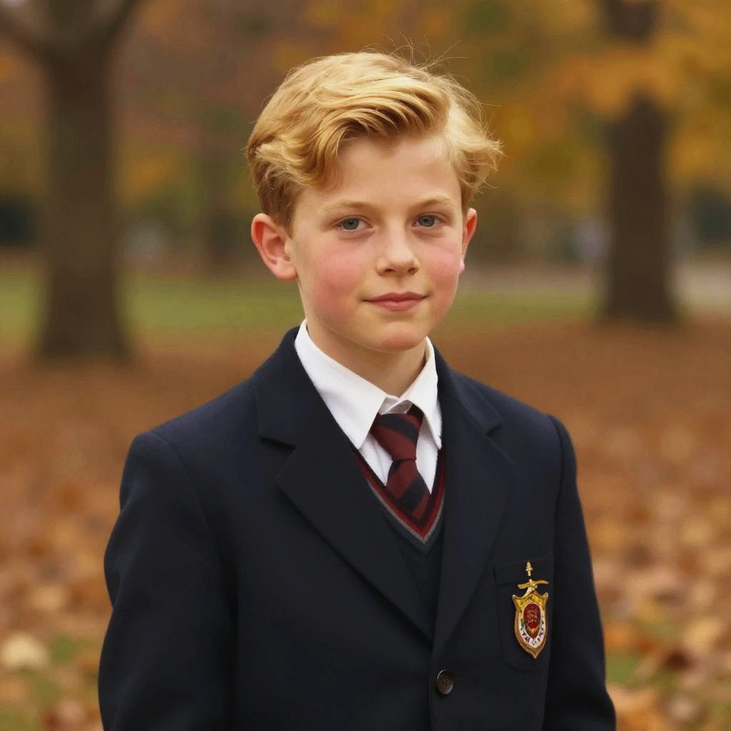 Strawberry blonde boy hair styled neatly, vintage school uniform, autumn park backdrop with falling leaves, warm tones, nostalgic feeling, painterly digital art style