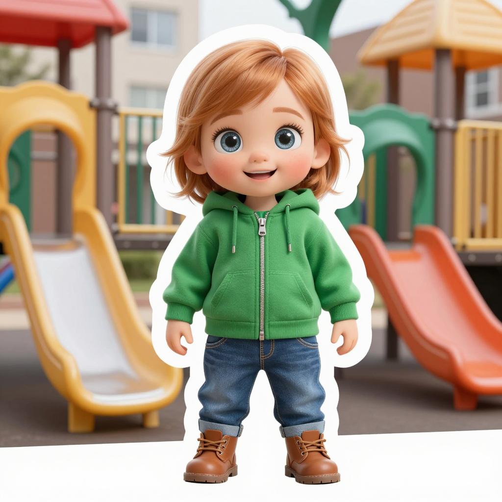 A hyperrealistic 3D full-body sticker of a toddler with straight ginger hair, big sparkling brown eyes, and a cute smiling face. The toddler wears a green zip-up hoodie, denim jeans, and brown boots. The background features a quaint urban playground with colorful slides in yellow and green, along with orange play structures. The image has a white background with neon highlights.