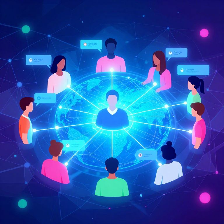 Omegle chatting concept illustrated with a diverse group of faceless people connected through glowing thread lines, digital mesh network background, vibrant and futuristic color scheme with blues, pinks and greens, symbolic of global online communication