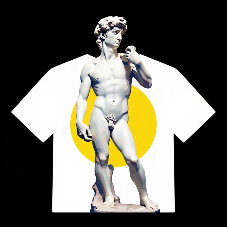 Digital art of a nude, muscular, classical-style male statue with short hair, standing against a black background with a white, yellow-rimmed shirt