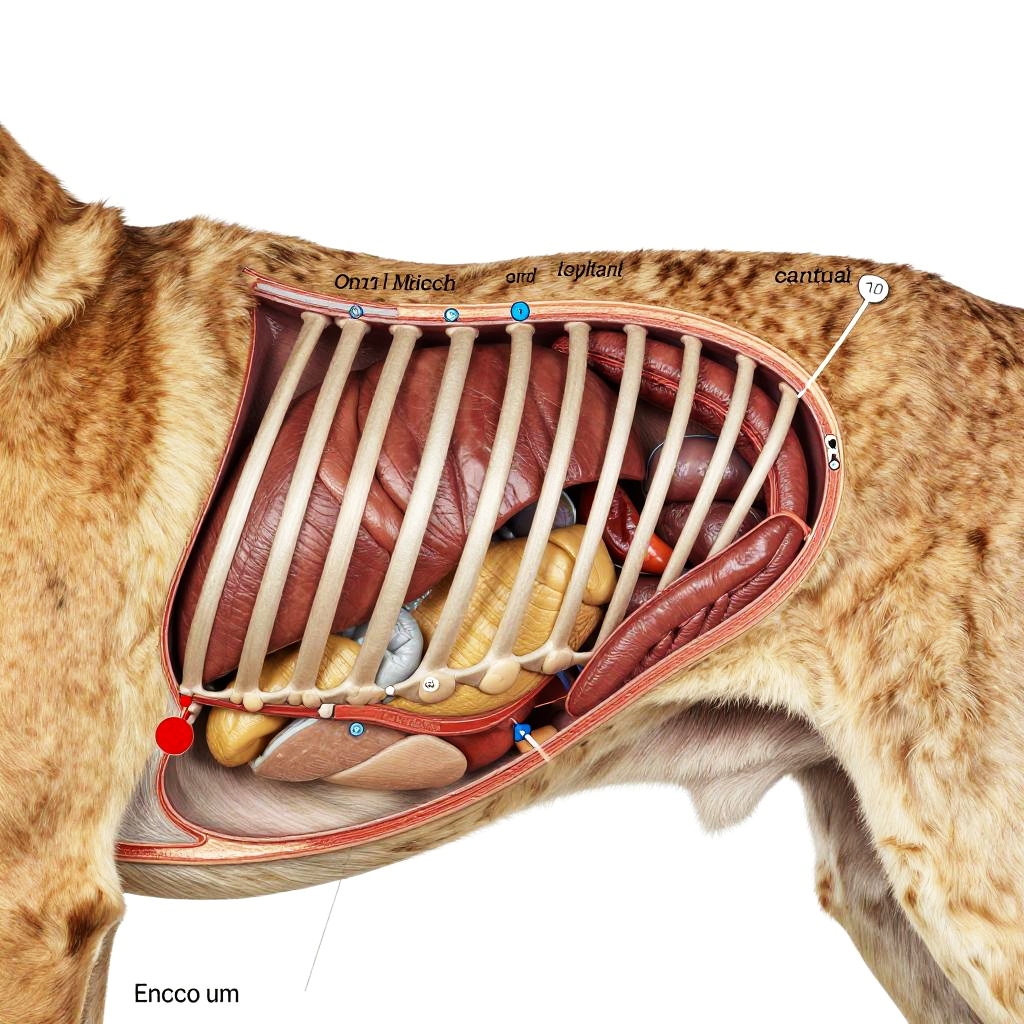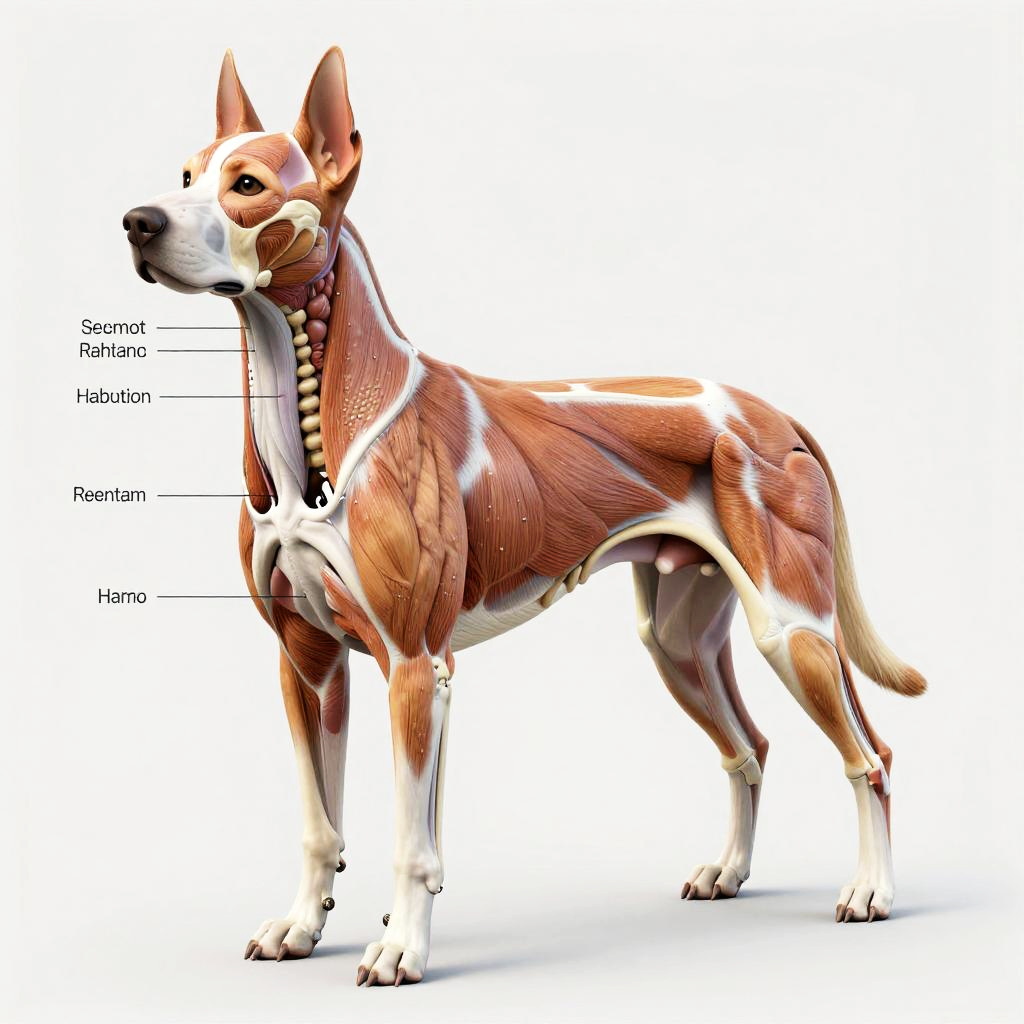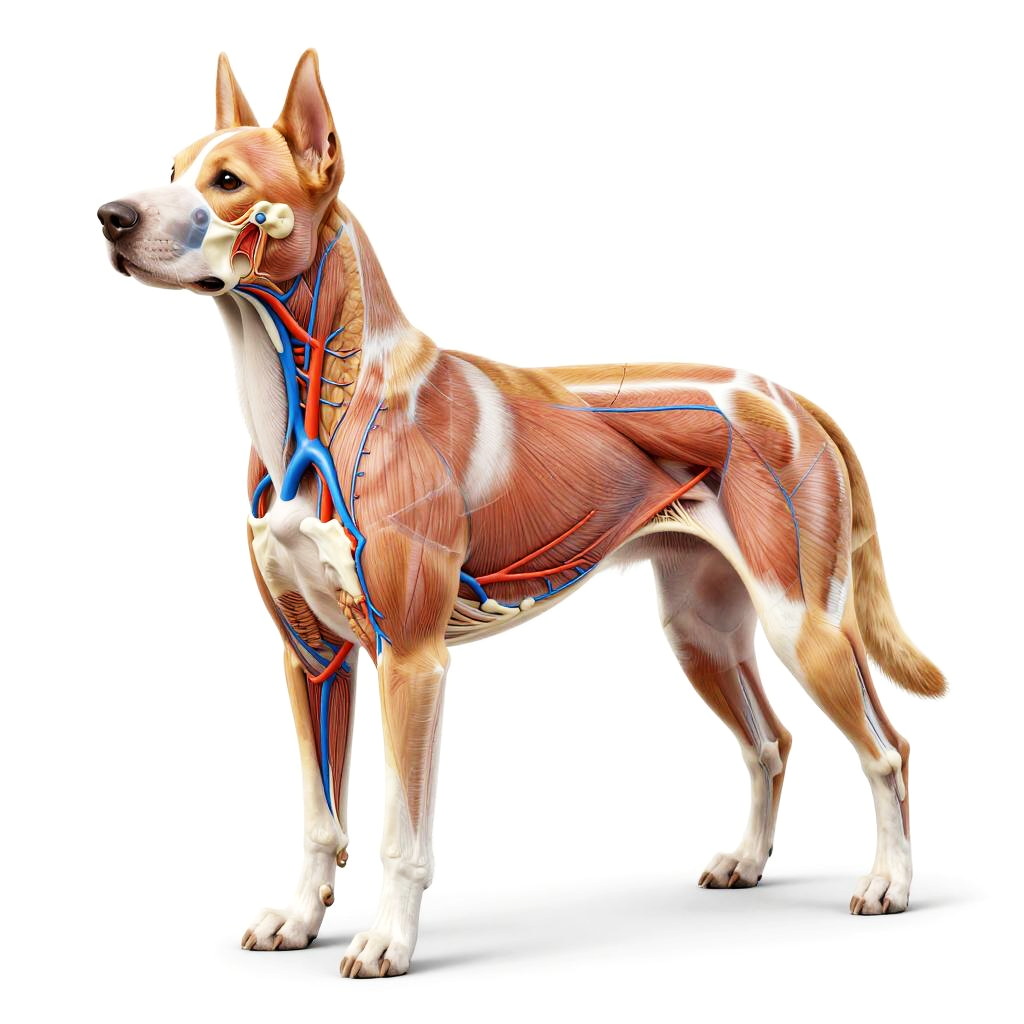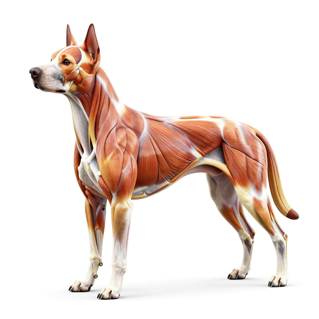 Dog anatomy reference, side view of a dog's muscular system with transparent skin overlay, dynamic pose showing muscle groups and bone alignment, bright studio lighting, clean lines, anatomical accuracy, professional veterinary diagram style