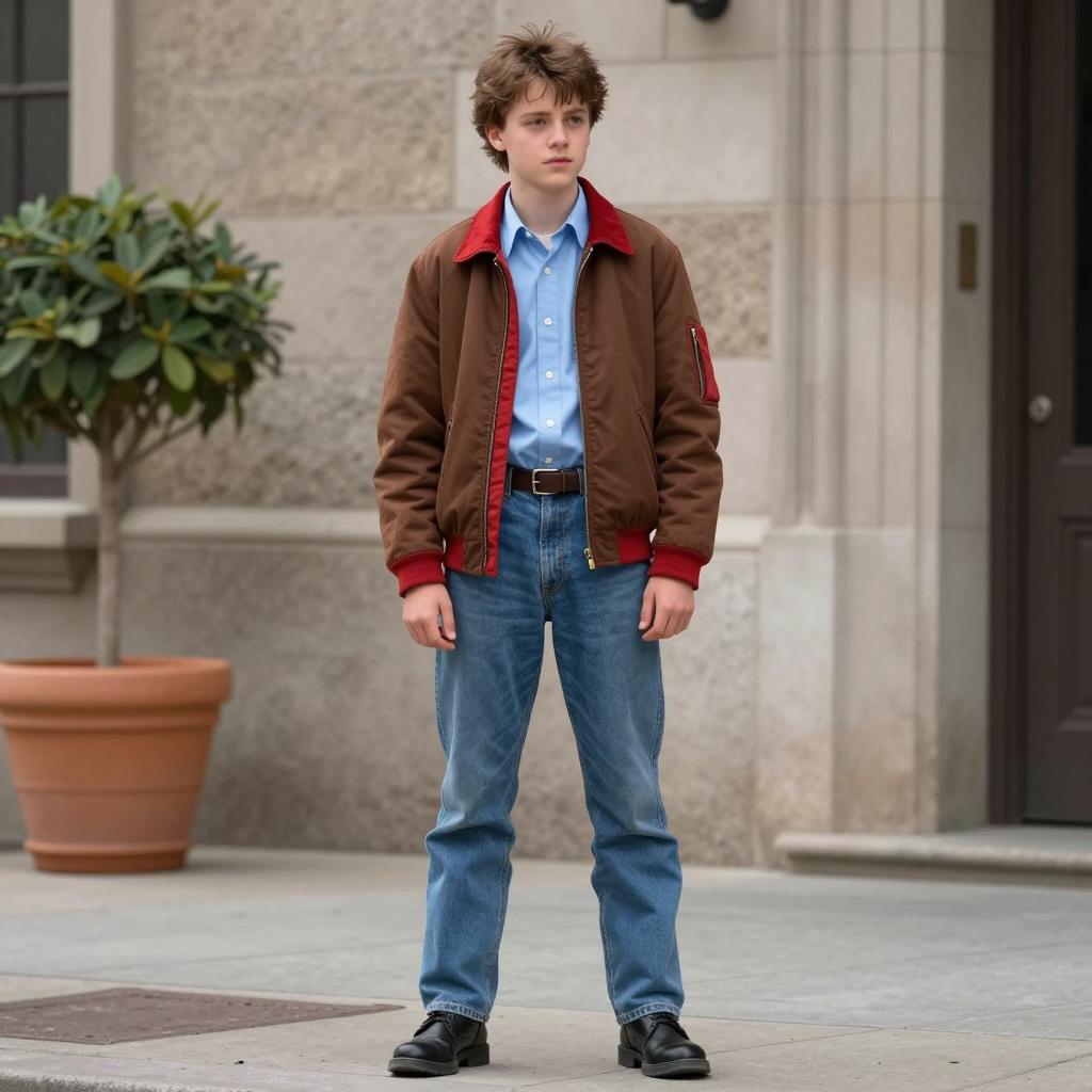 Harry home alone costume, photograph of a young boy standing in front of a white door, wearing a dark green jacket with horizontal stripes, red and black striped shirt, black pants, and black shoes with yellow stripes, light brown hair, beige wallpaper, small plant in a black pot on the left, framed picture on the wall, wooden bookshelf with books on the right, red carpet, daytime, neutral expression, casual attire, indoor setting, realistic style, medium shot, centered composition