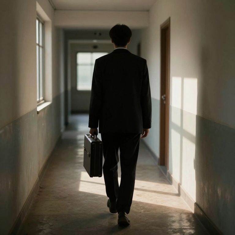 Silhouetted man in a suit, carrying a briefcase, walks down a dimly lit, sunlit hallway, leading to a brightly lit